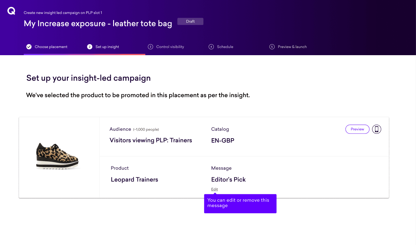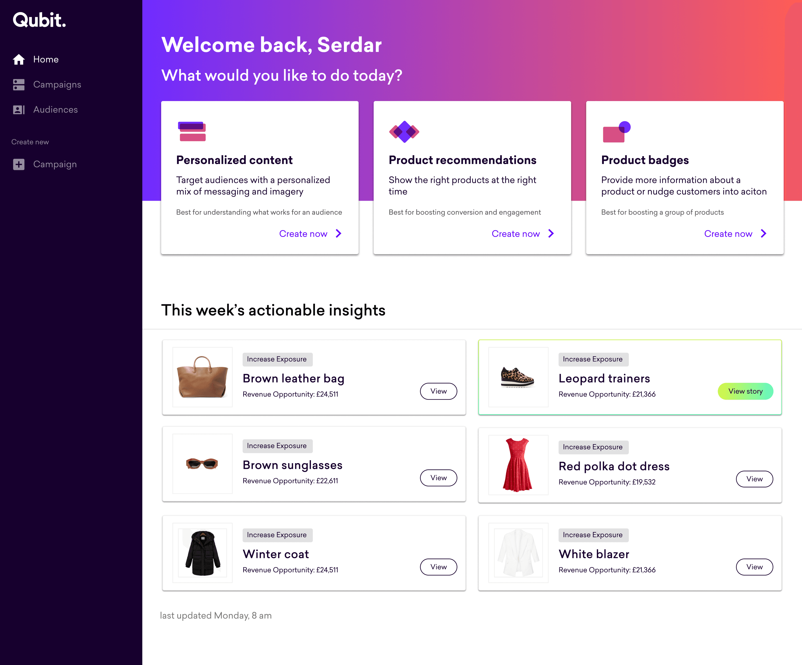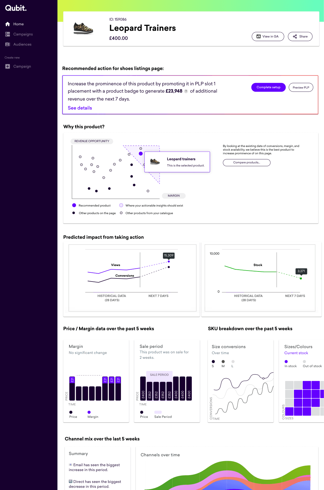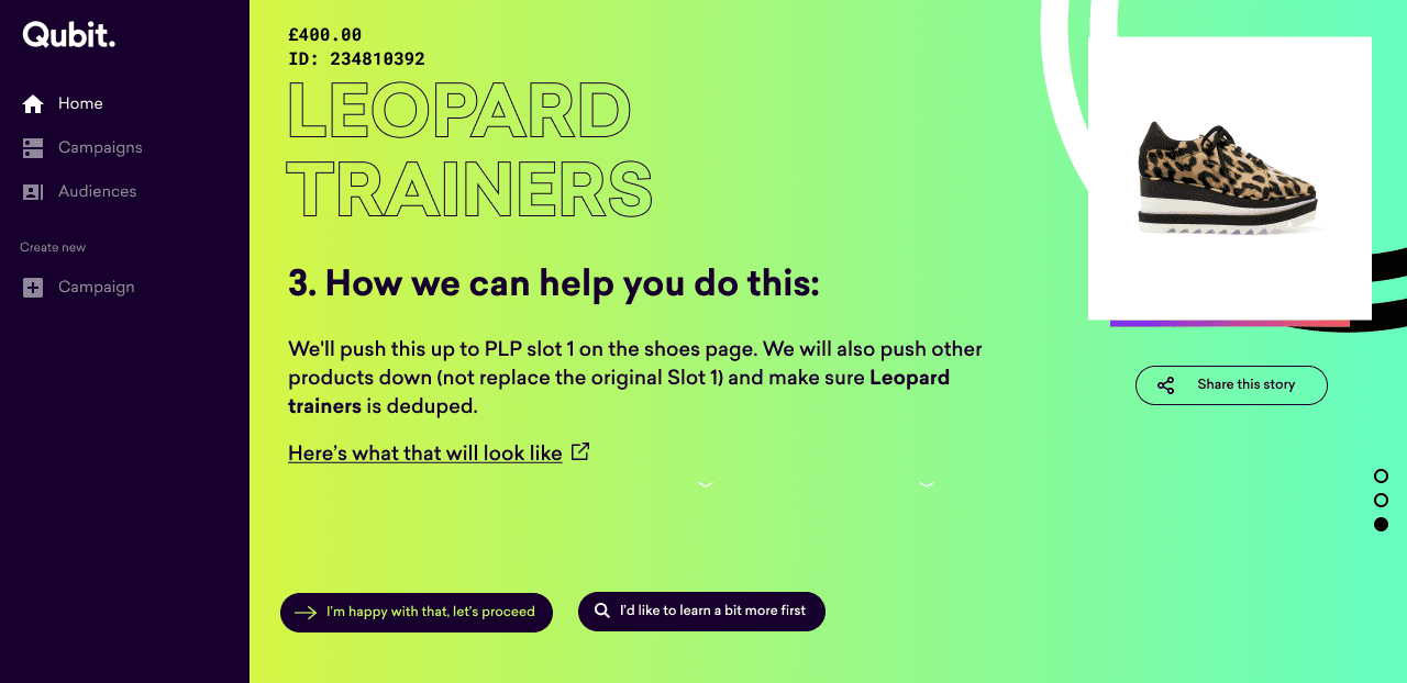 For Qubit Grow - we were looking into adding something to our product that would leverage all the product and the (end) customer data we had access to. This would also create stickiness indirectly as it’d give the merchandisers something to start from.