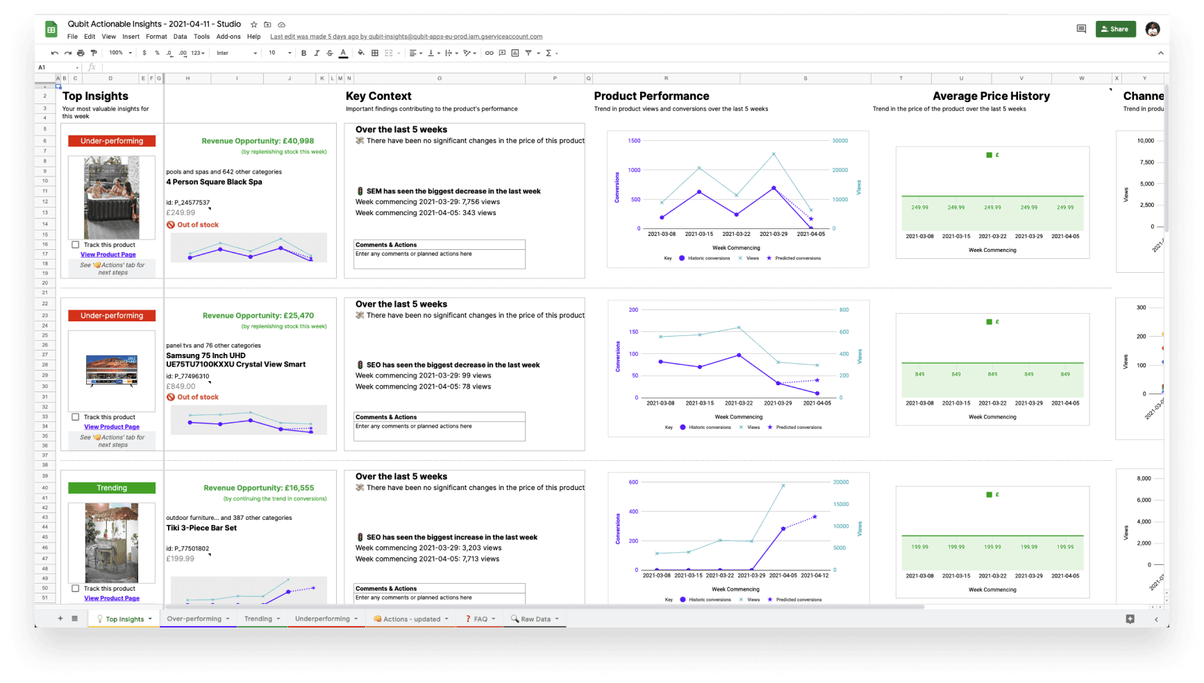 A user-research focused process that over multiple research rounds and iterations helped us build our weekly insights product - first in Google Sheets, and then migrate it to our existing product - Qubit for Merchandising