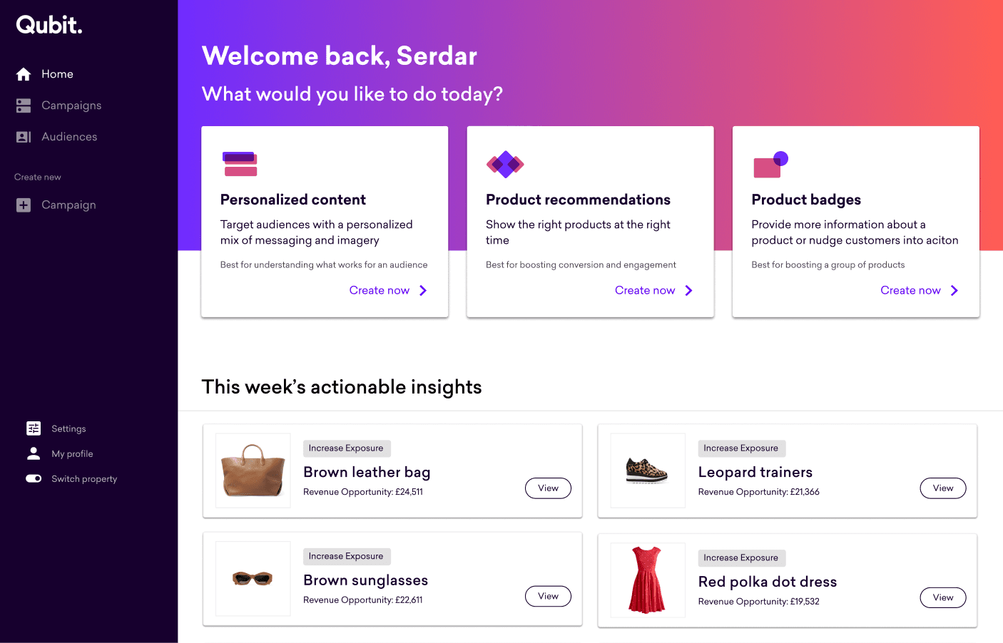 Qubit Start had all the personalization tools to create campaigns: Personalised content, product recommendations, and product badging.