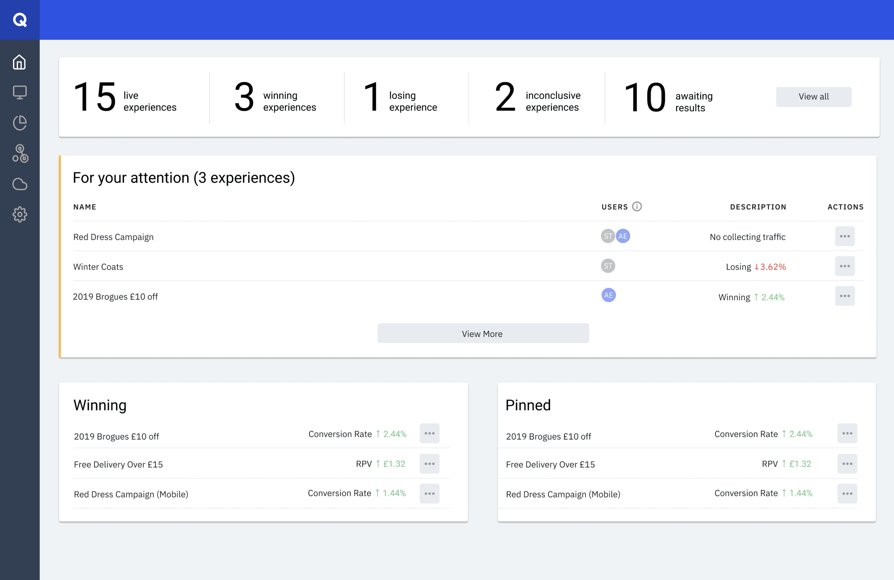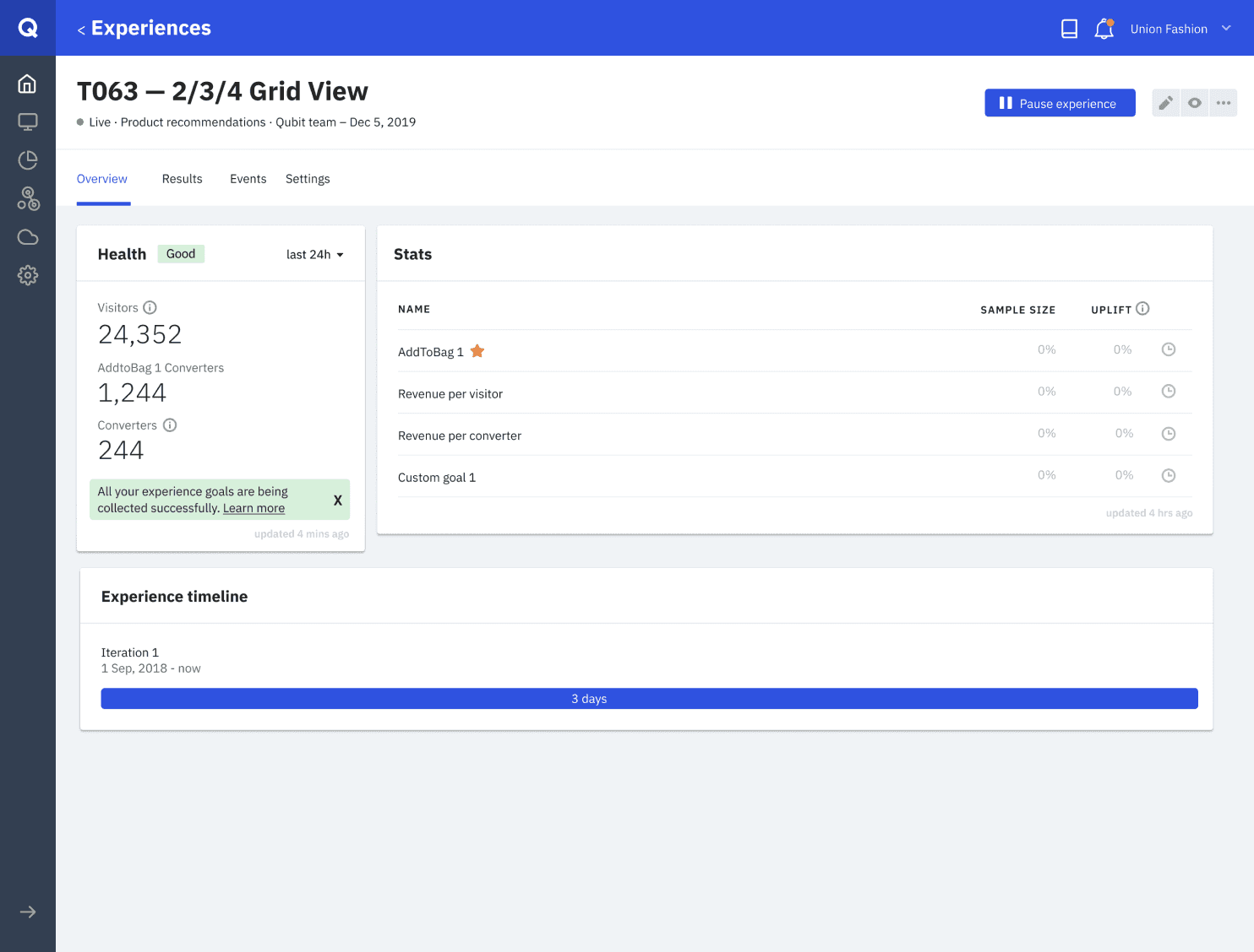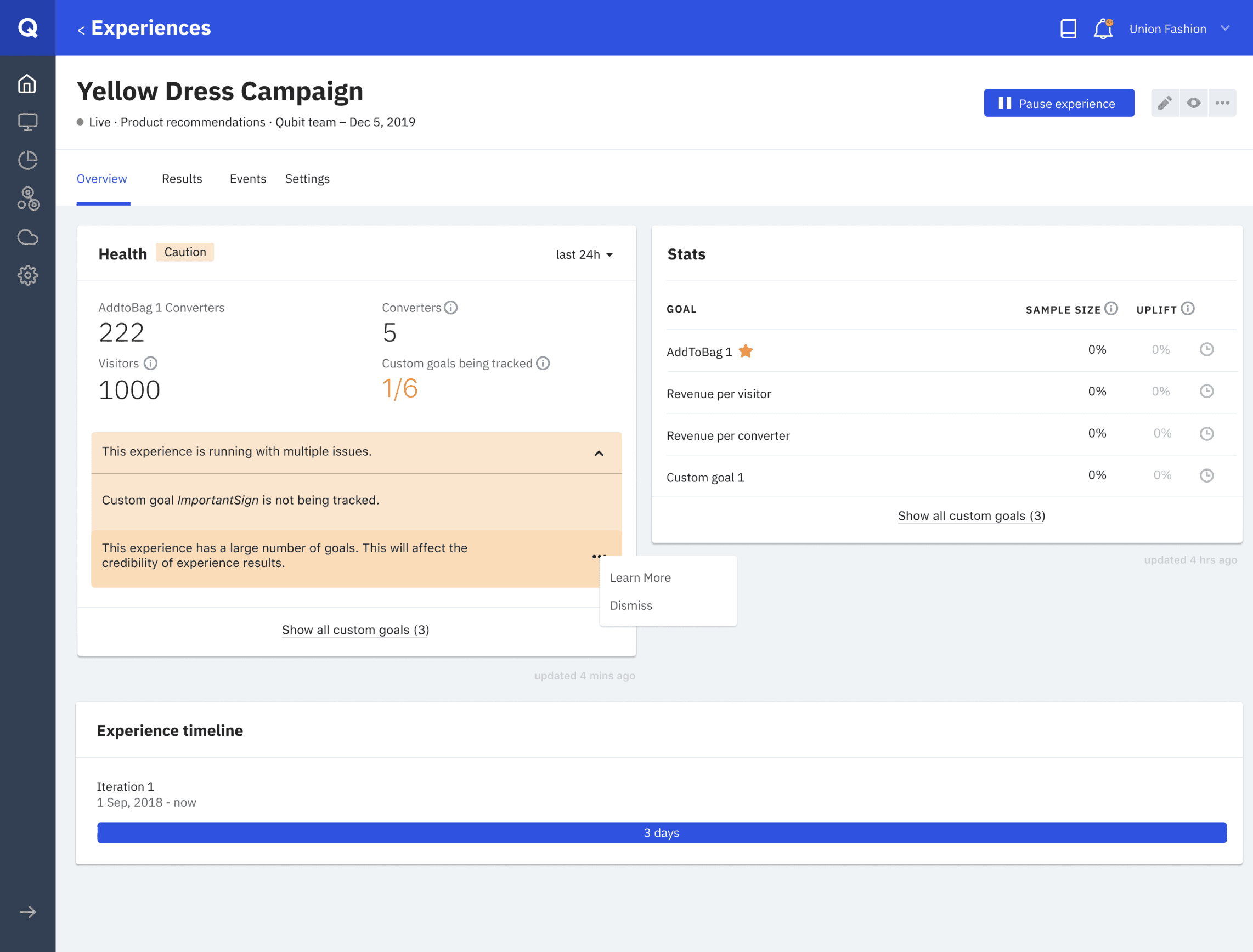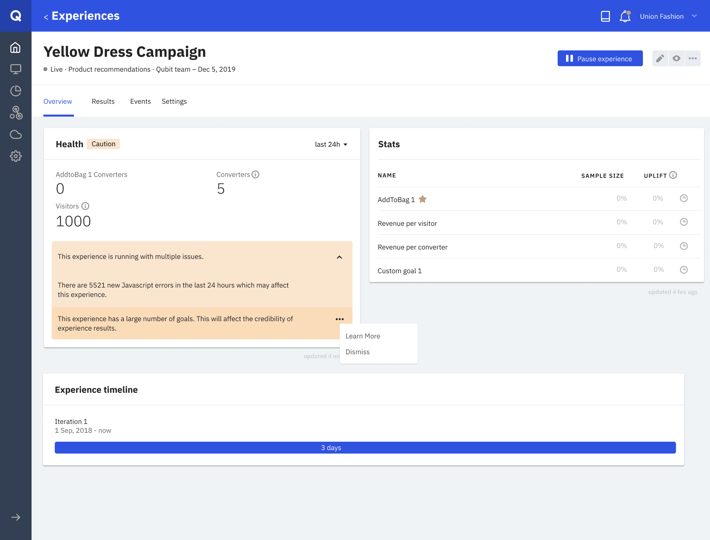 Further down the road, we've started working on turning this health card into a health hub, a place for clients to check everything regarding the experience's health i.e. how many clients are viewing the experience with errors or if the experience has too many goals.
