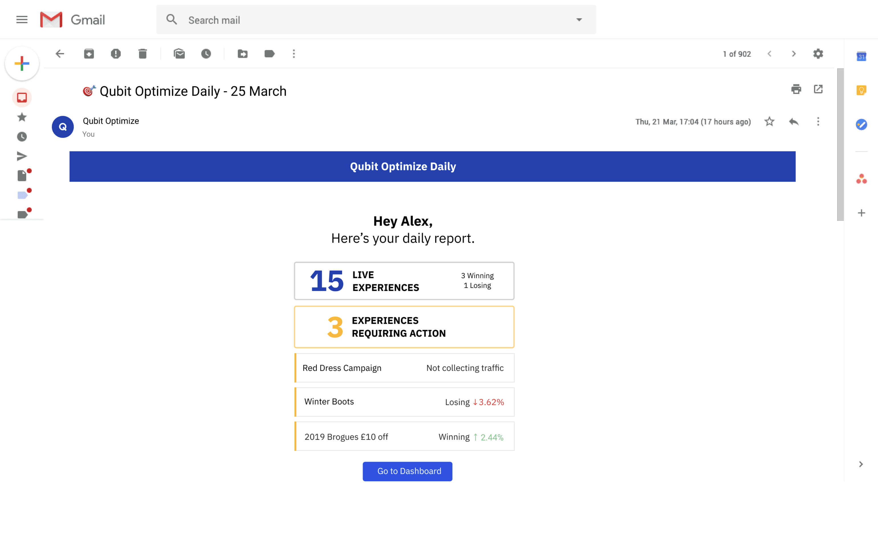 - An e-mail was only going to cause more problems than it solved. Our target user, the optimization manager, is already in the platform on a daily basis, and an e-mail will either slip past by their attention or could falsely alert "the buyers" - people who were responsible for acquiring technologies like Qubit in those companies but who rarely log into the platform.