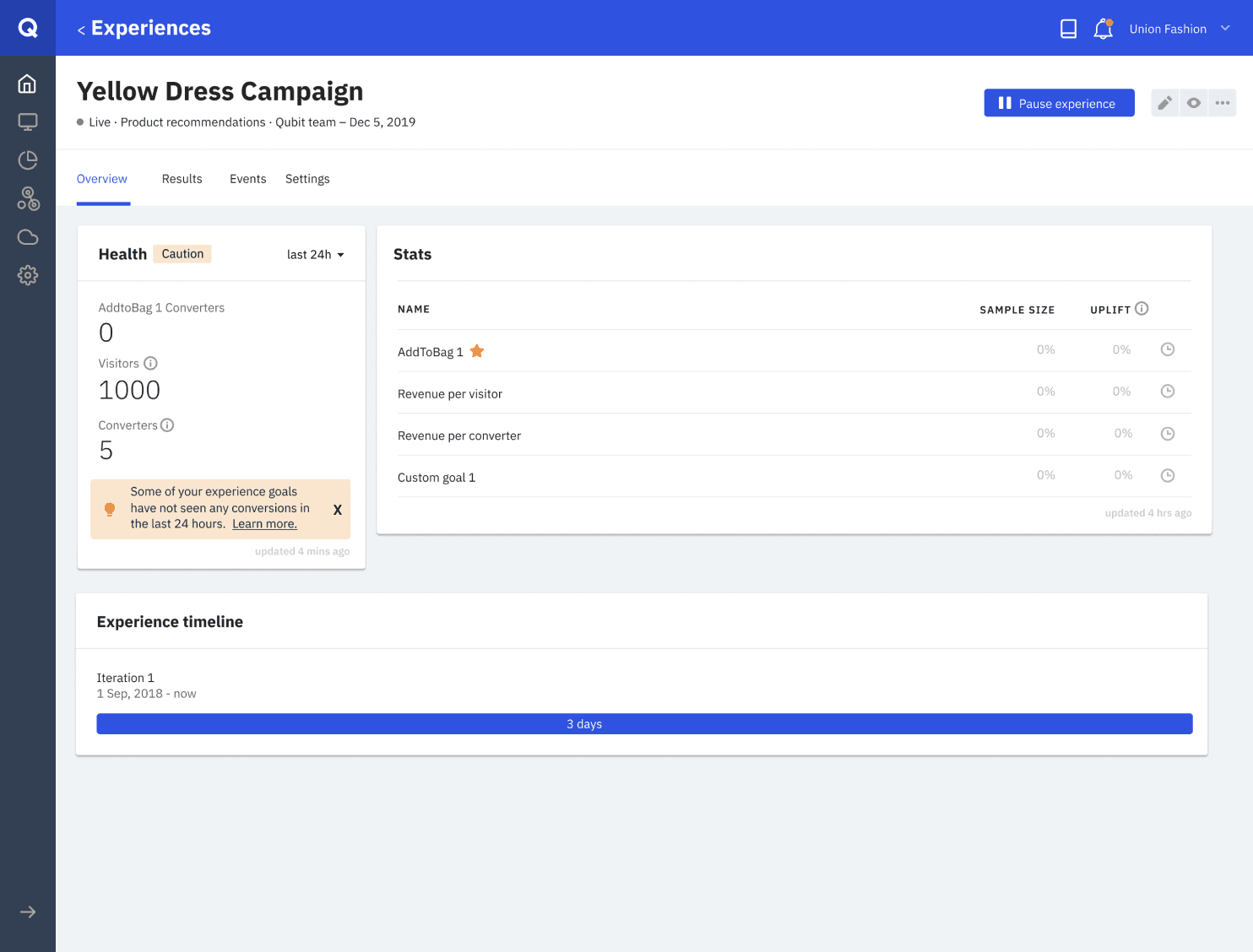 While experience health was focused on the recent activity (which made sense as the user would ideally check shortly after an issue had happened), customers would also be able to switch between the last 24 hours or all time to ensure they are seeing the right number of views, converters, etc.